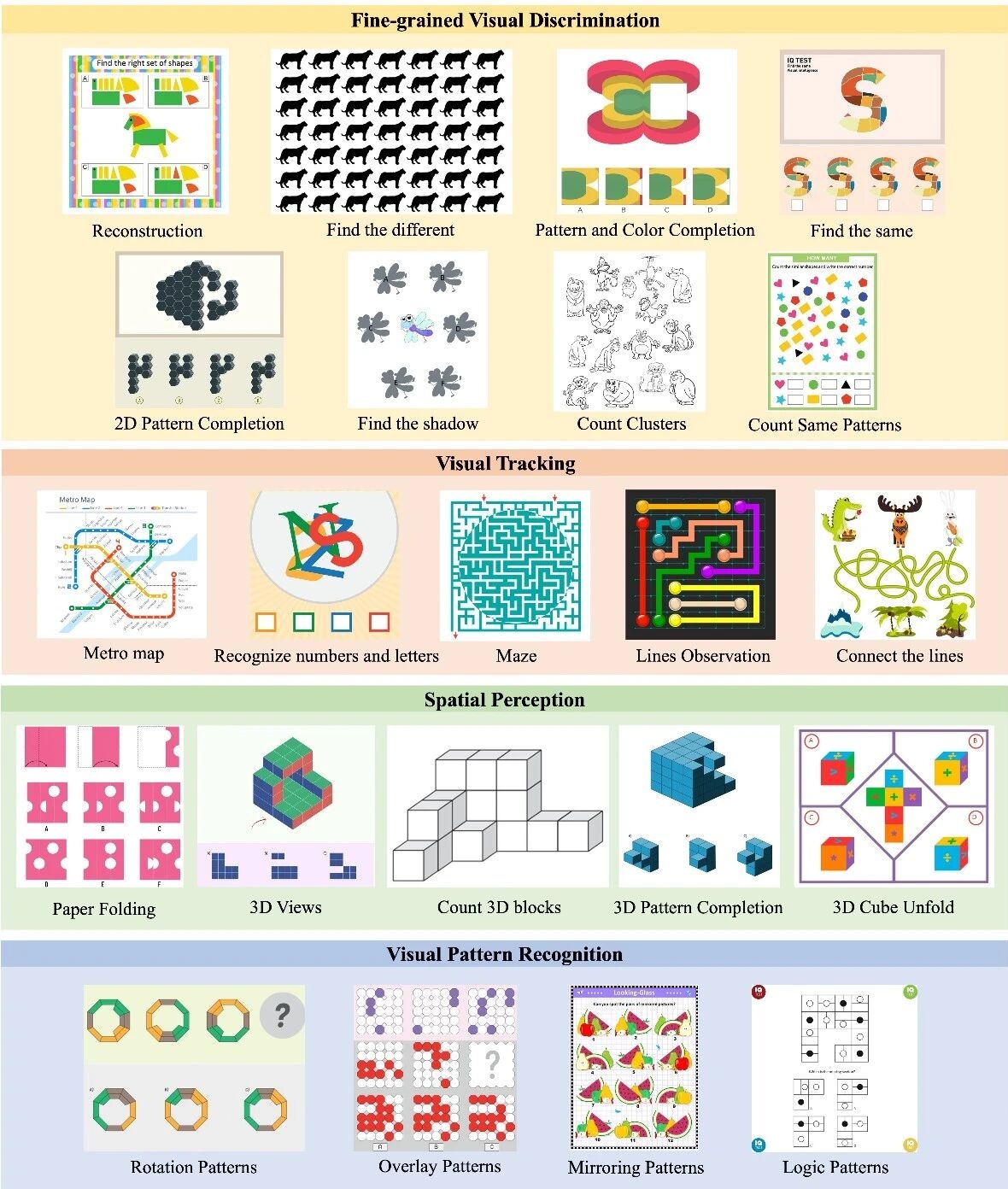 • 视觉模式识别(Visual Pattern Recognition):识别逻辑与几何规律(4 个子任务)