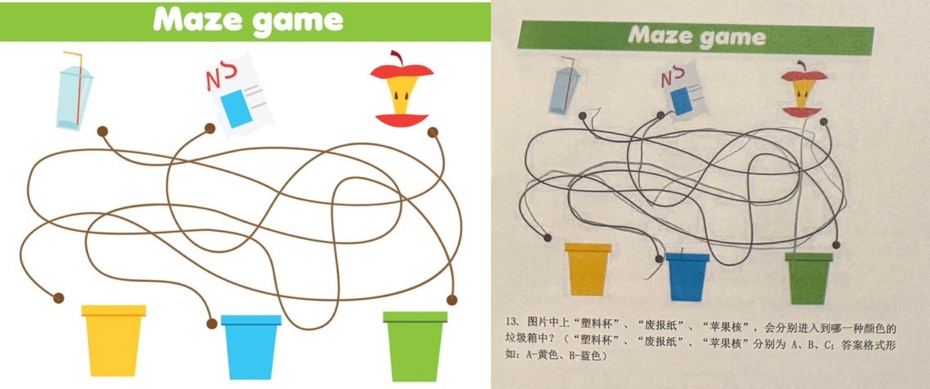 三件物品沿着线分别连到哪个颜色垃圾桶?