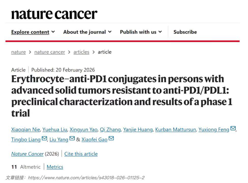 2月20日,西湖生物在《Nature Cancer》发表了全球首个工程化红细胞-抗PD-1抗体偶联药物(WTX-212)的I期临床研究结果。研究显示,该药物在对PD-1/PD-L1耐药的晚期实体瘤患者中安全性良好,并实现了包括完全缓解(CR)在内的客观缓解。该成果获同期《Nature Cancer》专题解读,被认为是克服免疫治疗耐药的极具转化价值的新方向。