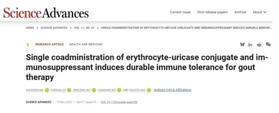 同时,团队也在近期于《Science Advances》发表了针对难治性痛风的最新研究,并获《Nature Reviews Rheumatology》重点报道。研究提出利用红细胞靶向脾脏诱导免疫耐受的策略,有效解决了尿酸氧化酶药物易产生抗药抗体(ADA)的临床痛点。动物模型显示,一次联合给药即可建立持久耐受,为高免疫原性蛋白药物的长期应用开辟了新路径。