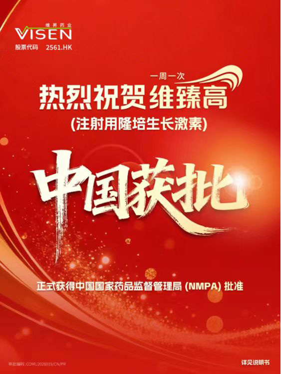 隆培生长激素是截至目前唯一被临床试验证实优效于生长激素日制剂的长效生长激素,也是FDA和EMA批准的首个用于儿童生长激素缺乏症(PGHD)的长效生长激素。其获批是维昇药业从研发迈向商业化的重要里程碑,体现了公司‘全球创新,中国落地’的承诺。