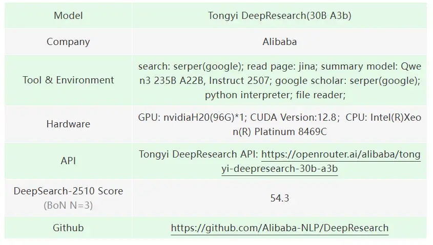针对市场上不断涌现的开源模型和API,xbench团队也自己搭建了环境,并部署进行了评测。由于不同环境对模型评测结果会有一定影响,因此未直接纳入Leaderboard榜单进行对比。评测时部署的环境和配置如下: