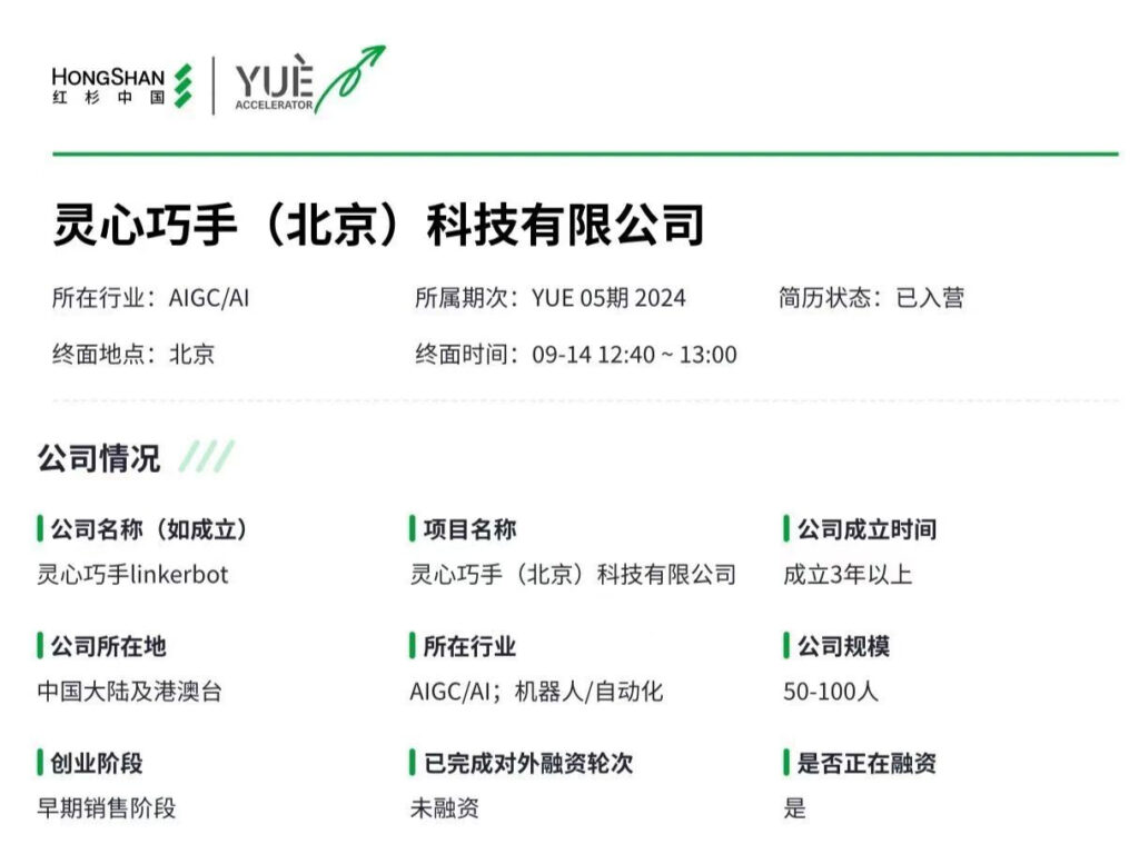 因为就在上个月,灵心巧手完成了近15亿人民币的B轮融资,估值达到百亿人民币。得益于市场对具身智能的热情,它也成为全球估值最高的灵巧手企业之一。同时,灵心巧手也成为了红杉YUE创业加速器成立3年多来出现的首个独角兽公司(估值超过10亿美元)。